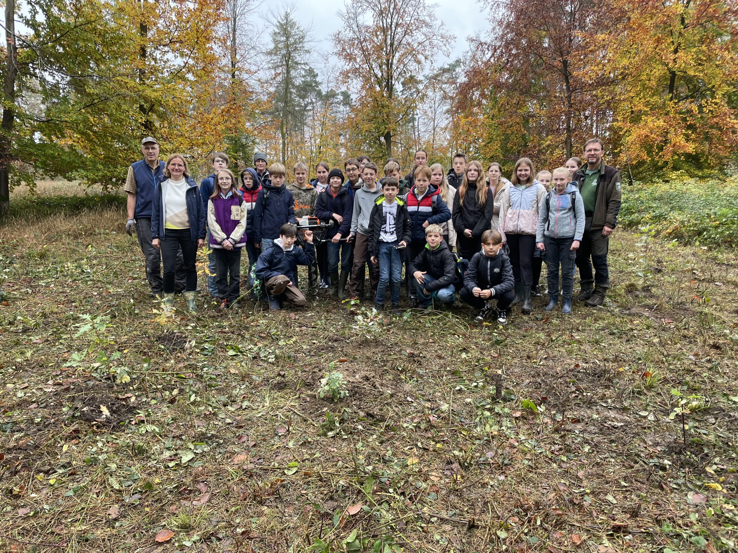 Und so begaben sich vor einigen Tagen die Schülerinnen und Schüler der 7Rb auf eine Wanderung in ein Wandstück westlich von Brakel, in dem Stadtförster Harald Gläser gemeinsam mit seinem Team eine Parzelle von niedrigem Bewuchs (vor allem Brombeeren) befreit und mit einem speziellen Bohrer Pflanzlöcher vorbereitet hatten. Projektleiterin Annette Karweg berichtet vom Ablauf vor Ort: „An der Pflanzstelle angekommen hat Herr Gläser nochmal sehr eindrucksvoll mit der Klasse besprochen, warum wir in den vergangenen Jahren so viel Wald ‚verloren‘ haben und warum das Nachpflanzen von Bäumen so wichtig ist.“ Zudem habe er die Vorzüge der Pflanzung unterschiedlicher Bäume und vor allem der Eiche erläutert. „Dabei haben die Schülerinnen und Schüler erfahren, wie ein Wald aussehen muss, der dem Klimawandel gewachsen ist. Die Klasse war ziemlich beeindruckt, dass ihre Eichen, wenn sie gut angehen, noch in 200 Jahren hier wachsen werden!“