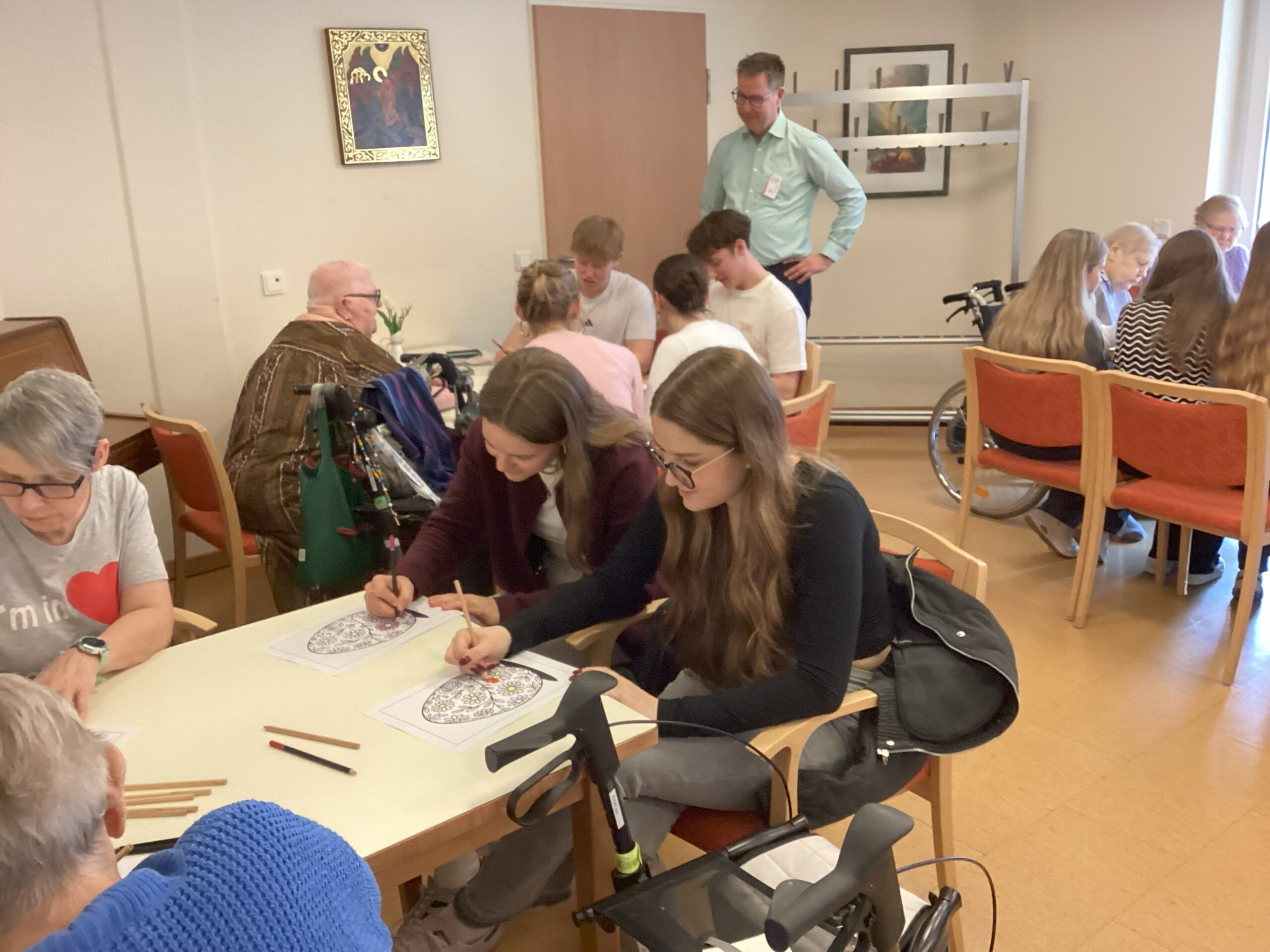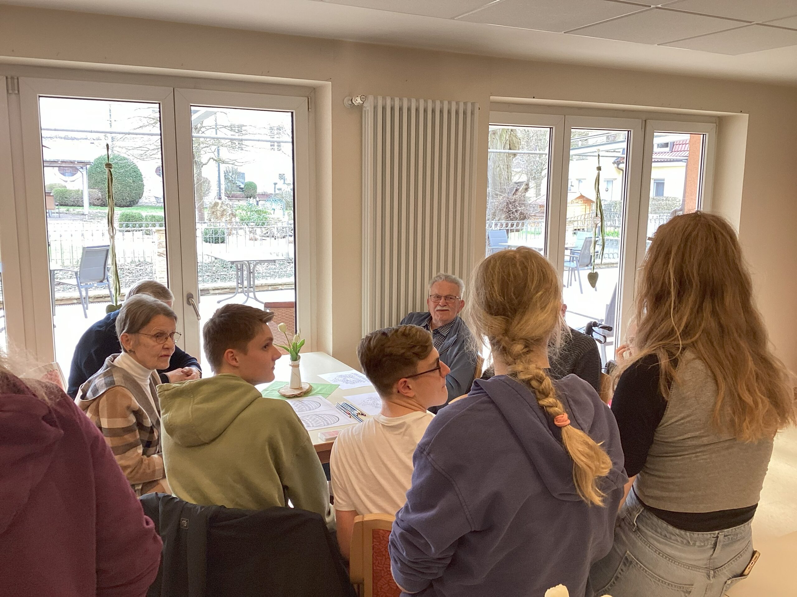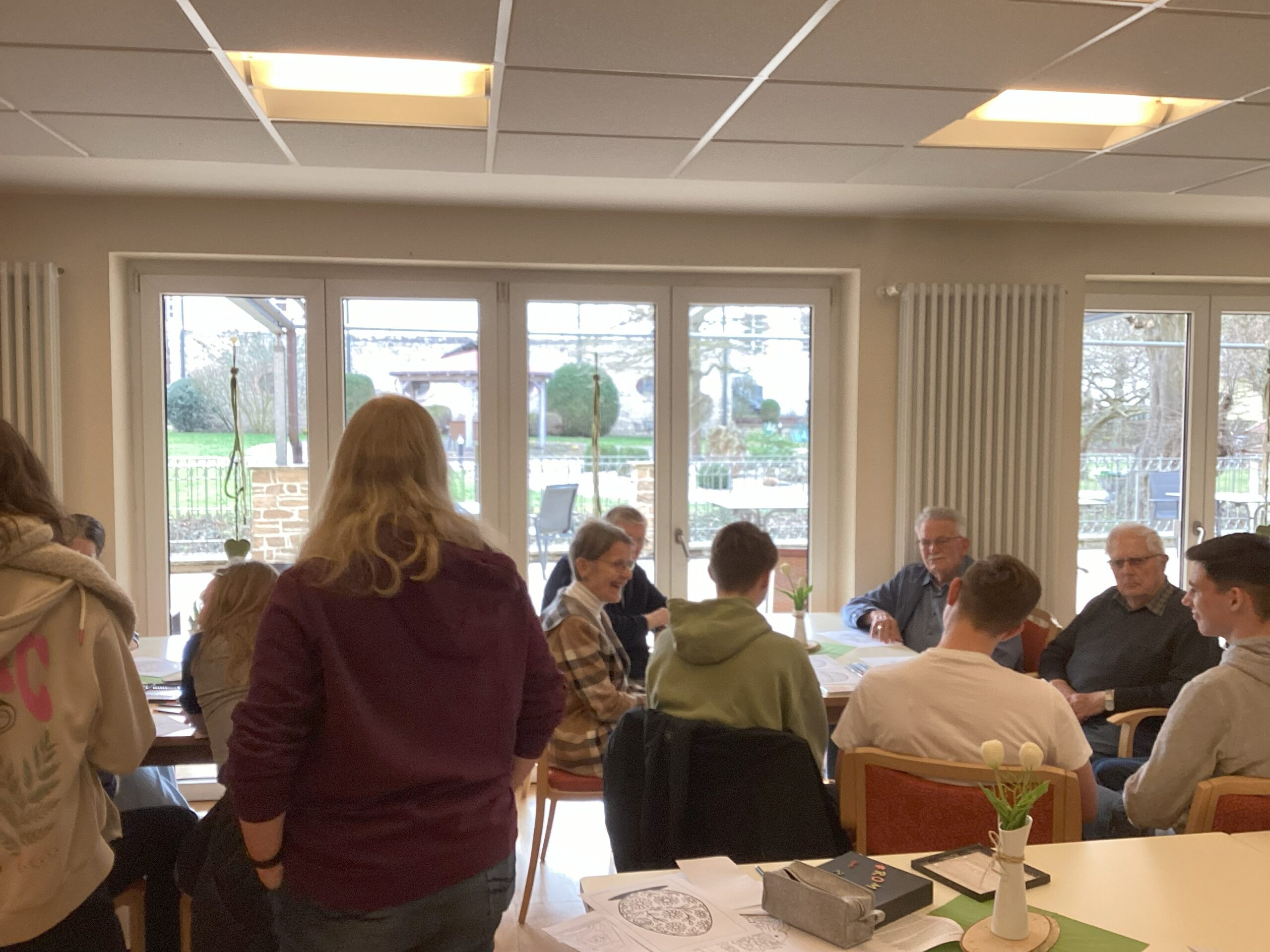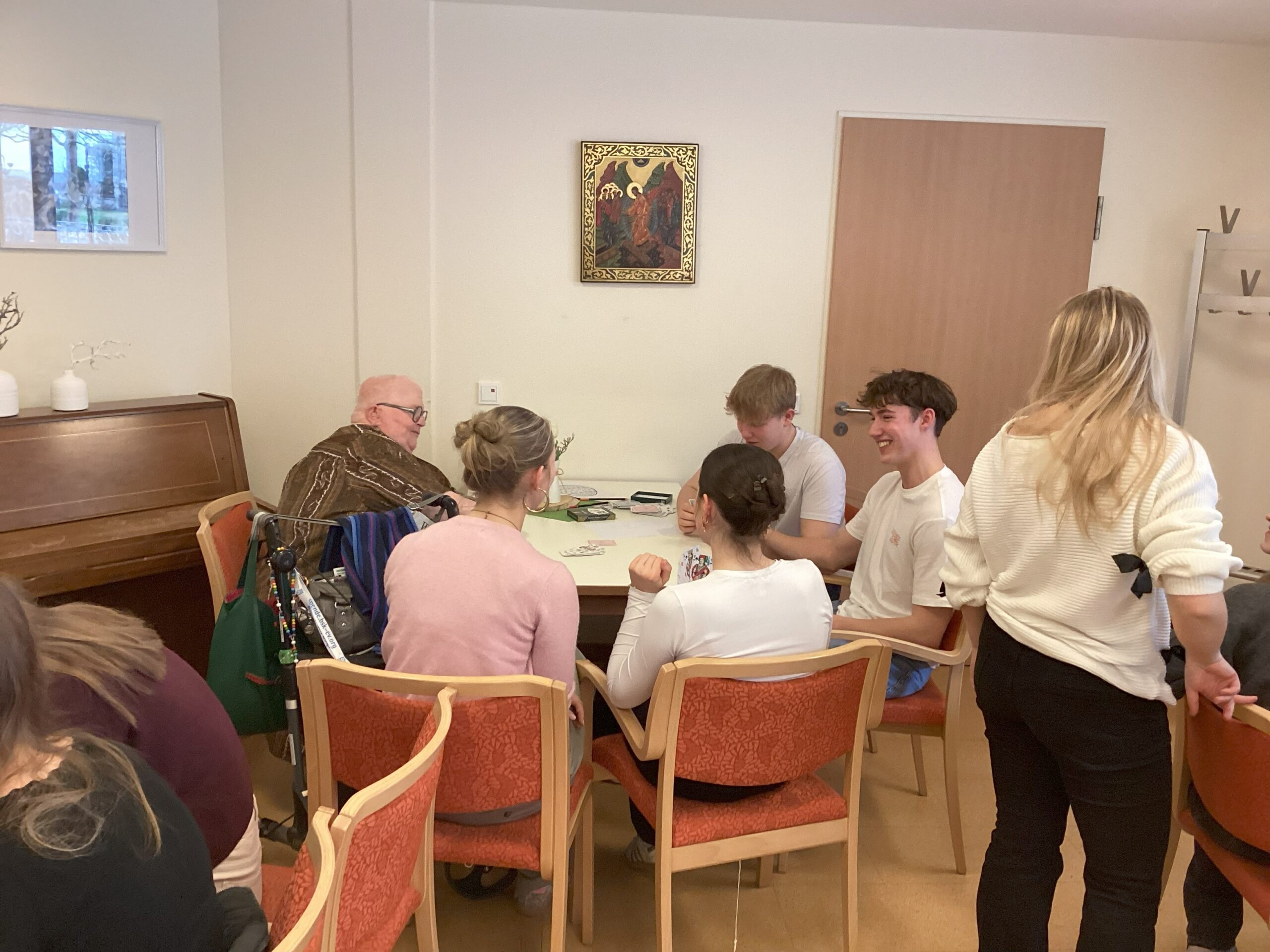 Anschließend war Zeit für einen schönen Austausch zwischen Jung und Alt, bei dem viele Geschichten und Erfahrungen geteilt wurden. So befragten einige Bewohner die Schülerinnen und Schüler zum Buch und der Idee das Seniorenheim zu besuchen. An anderen Tischen wurde gemalt und erzählt oder in geselliger Runde über die Spielzüge beim „Mau-Mau“ gelacht.