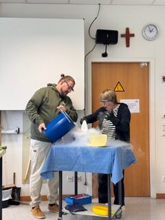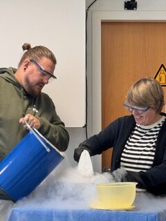 Die Schülerinnen und Schüler brachten eine flüssige Eismasse mit, zu der dann flüssiger Stickstoff gegeben wurde, während die Masse mit einem Handmixer verquirlt wurde. Das Ergebnis war superleckeres Eis, das anschließend auf dem Flur verköstigt werden konnte.