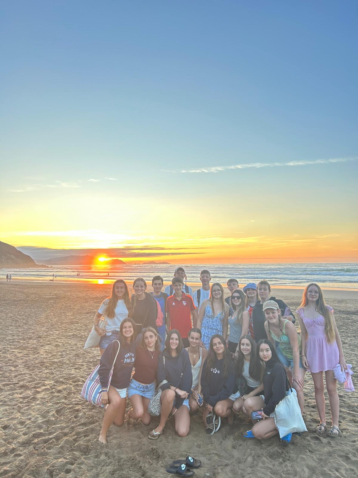 Aber auch unsere Freizeit kam nicht zu kurz. Ein Highlight war der Besuch eines Fußballspieles im Stadion von Bilbao. Das Fußballfieber hat sich in der ganzen Stadt verbreitet. Ein weiteres Highlight war der Besuch des Strandes. Bei sonnigen 30°C genossen wir das Meer und den beeindruckenden Sonnenuntergang. Ebenfalls gingen wir der baskischen Tradition des Pintxo Pote nach, wo wir uns zusammen mit den Spaniern durch die baskischen Tapas testeten. Natürlich durfte der Besuch der Brücke nicht fehlen. Die spanischen Gastschüler:innen haben schon einige Male von der Brücke Bungee-Jumping gemacht haben. Zur Erleichterung mancher konnten wir das leider nicht machen.