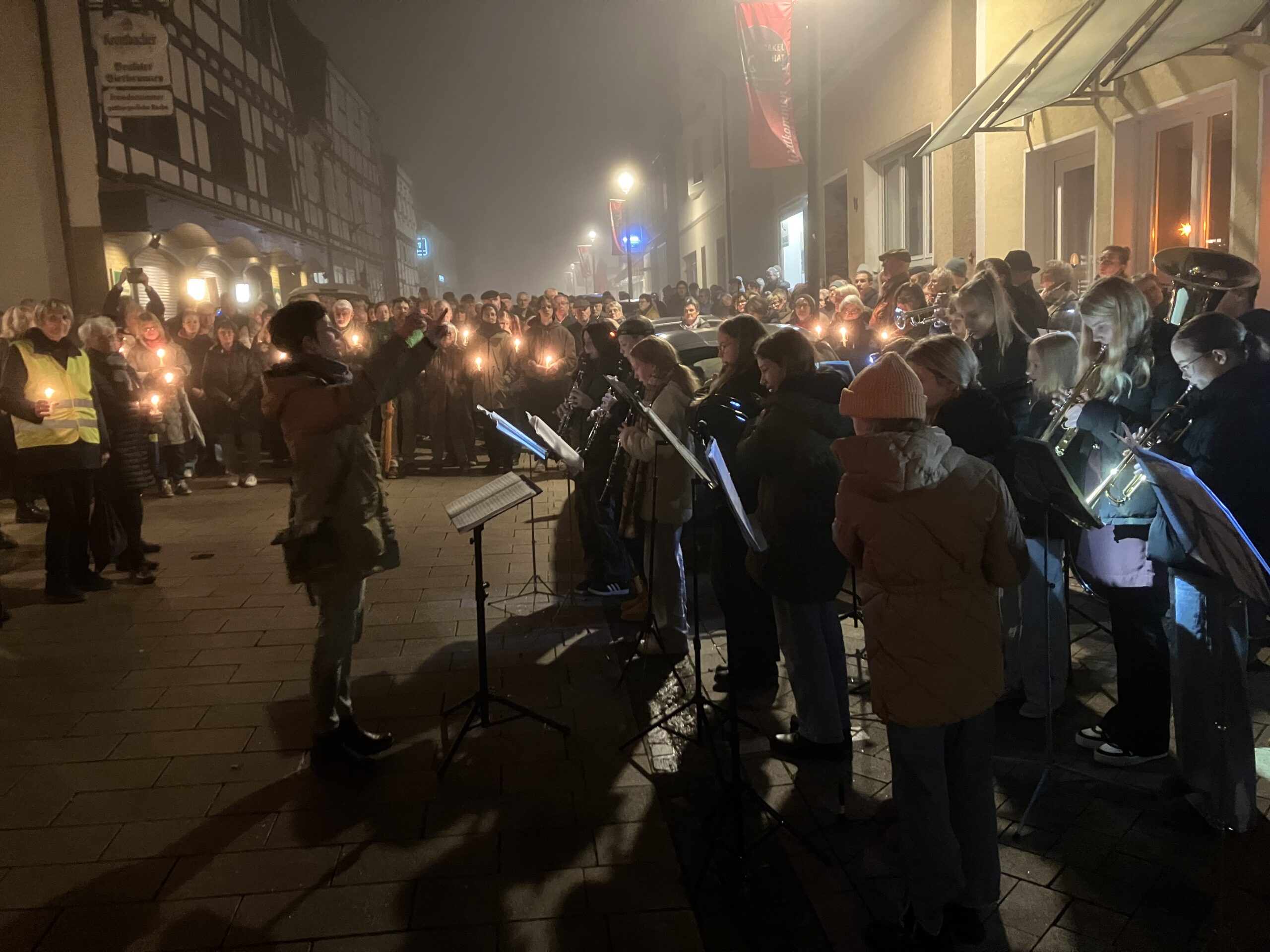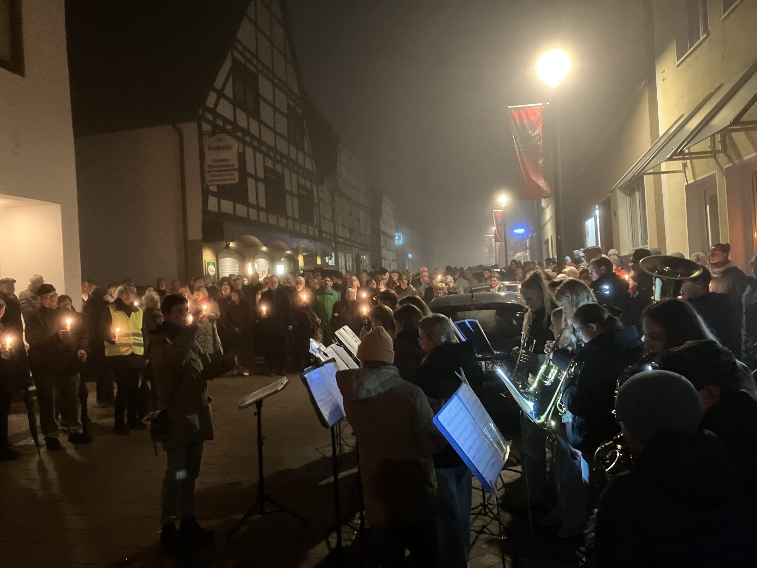 Die Veranstalter waren von der tollen Resonanz der Veranstaltung überwältigt: Deutlich mehr als 300 Personen sind abends in der Stadt zusammengekommen, um an fünf verschiedenen Stationen mit ihren Kerzen, Texten und mit ihrer Musik der ermodeten und entrechteten Menschen in Brakel zu gedenken. Neben der Bläserklasse unserer Schule waren noch beteiligt die Gesamtschule Brakel, die Gruppe „Autakt“ der katholischen Kirchengemeinde, der Jazz-Musiker Georg Rox und der Madrigalchor Brakel. Auch Bürgermeister Kleinschmidt und Pfarrer Kurte fanden bewegende Worte. Insgesamt war das sicher eine Veranstaltung, die auch unsere Schülerinnen und Schüler nachhaltig beeindruckt hat.