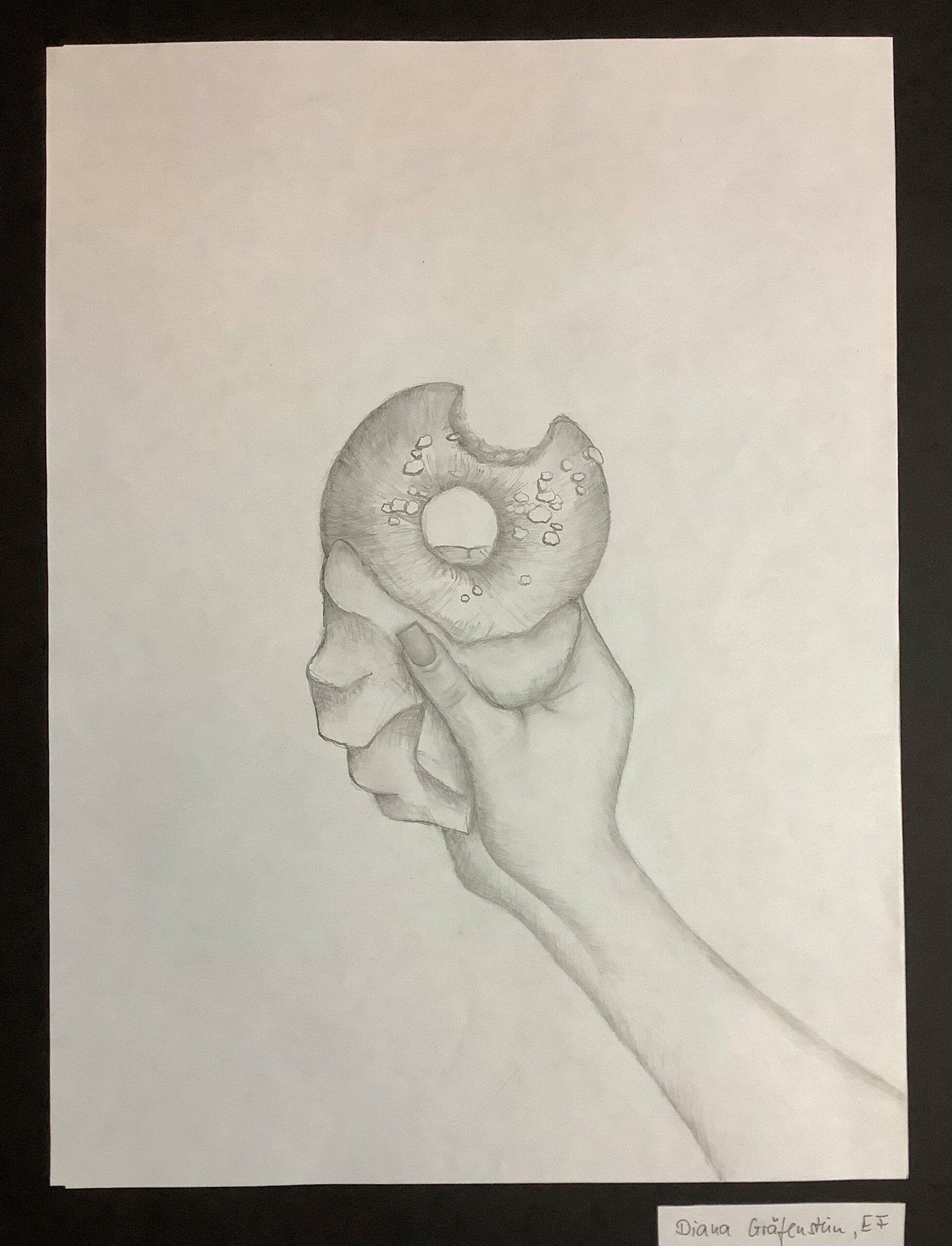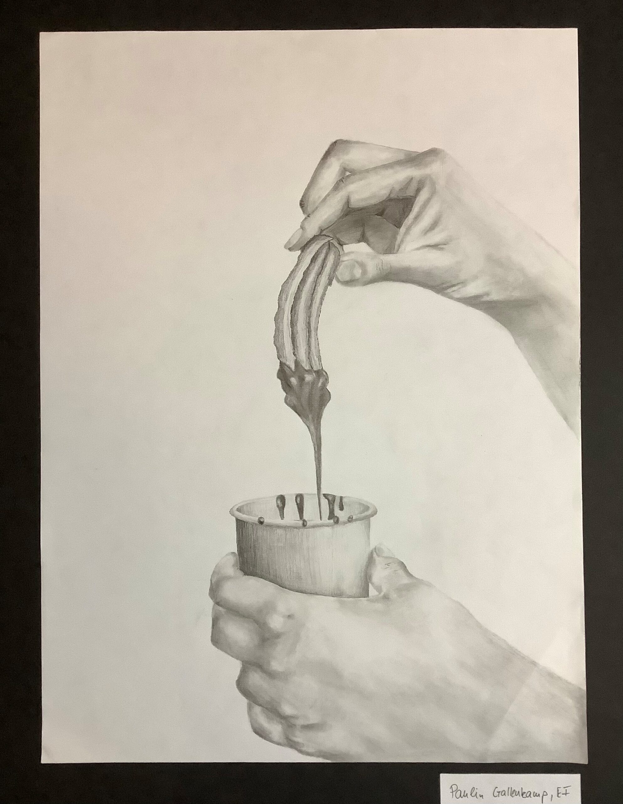 Paulin Gallenkamp (EF) „ Meine Idee war es, das Thema Fingerfood durch eine realistische und dynamische Darstellung eines Churros zu zeigen, der gerade in flüssige Schokolade getaucht wird. Dabei wollte ich den Moment festhalten, in dem die Schokolade langsam vom Churro tropft, um Bewegung und Lebendigkeit zu erzeugen. Das Motiv passt gut zur Aufgabenstellung, da ein Churro ein typisches Fingerfood ist, das direkt mit den Fingern gegessen wird. Mein Ziel war es, die Szene so echt und plastisch wie möglich wirken zu lassen, sodass das Fingerfood appetitlich und realistisch erscheint.“