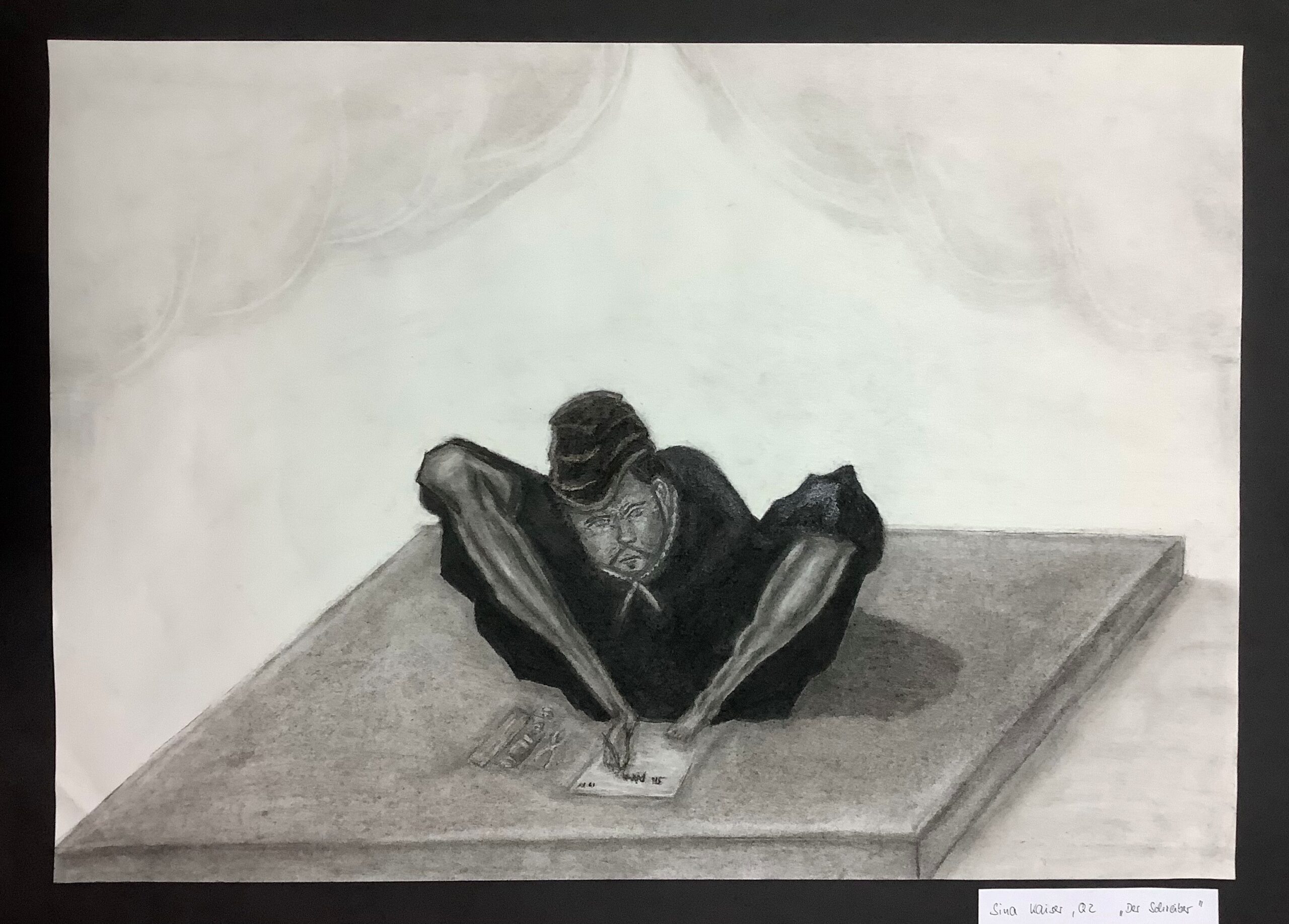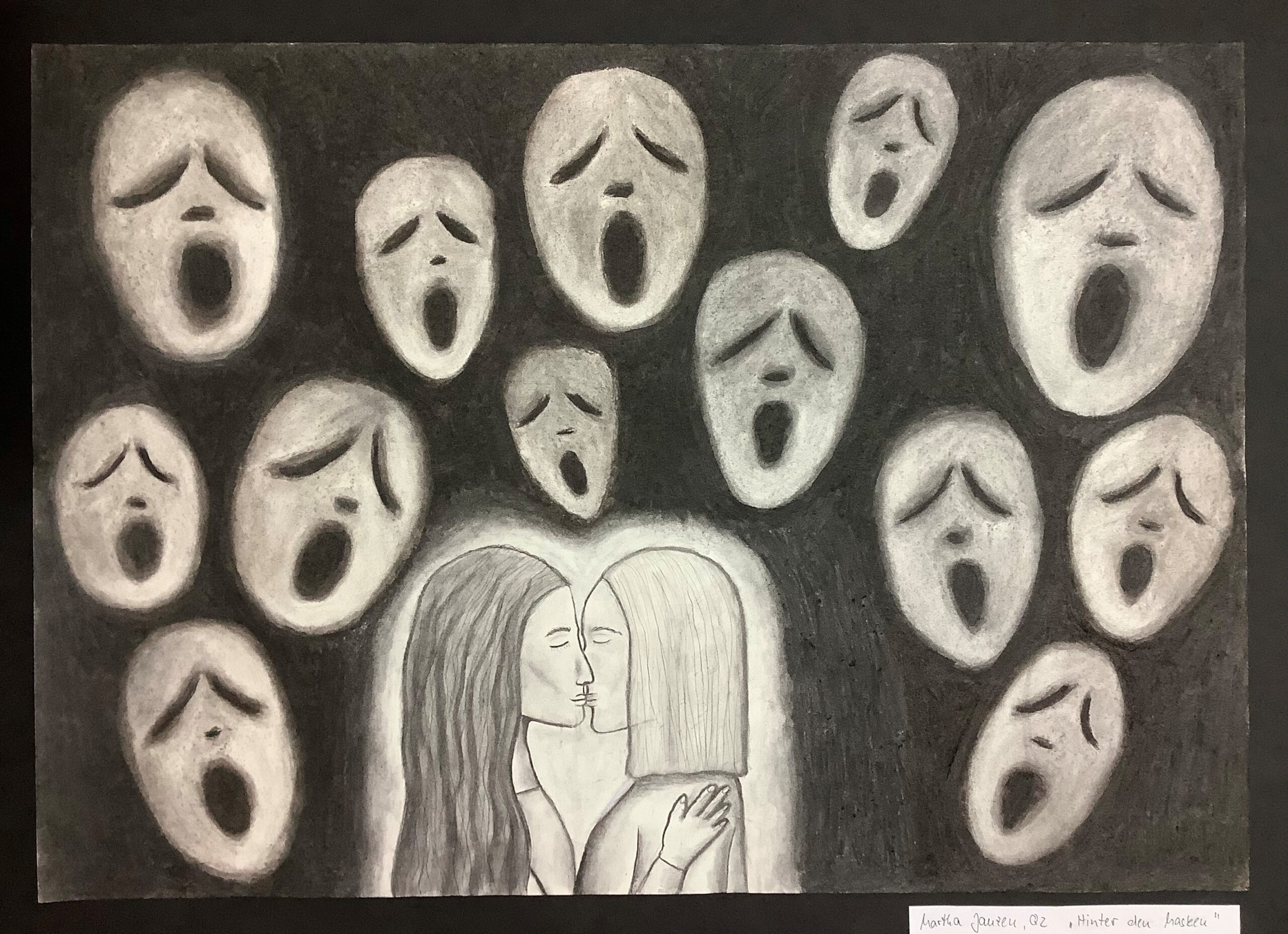 Lona Hoppe (Q2) „In meiner Bildgestaltung steht eine einzelne Frau im Vordergrund, deren leicht gesenkter Kopf und die nach innen gekehrter Körperhaltung eine starke Verletzlichkeit vermitteln. Die übergroßen männlichen Schattenfiguren, die anonym, massiv und dominant wirken, überragen die Frau kompositorisch und drängen sie räumlich in eine defensive Position. Die Zeichnung thematisiert geschlechterbezogene Diskriminierung sowie gesellschaftliche Drucksituationen, die häufig Frauen betreffen. Als Inspiration dienten unter anderem Arbeiten von William Kentridge.“