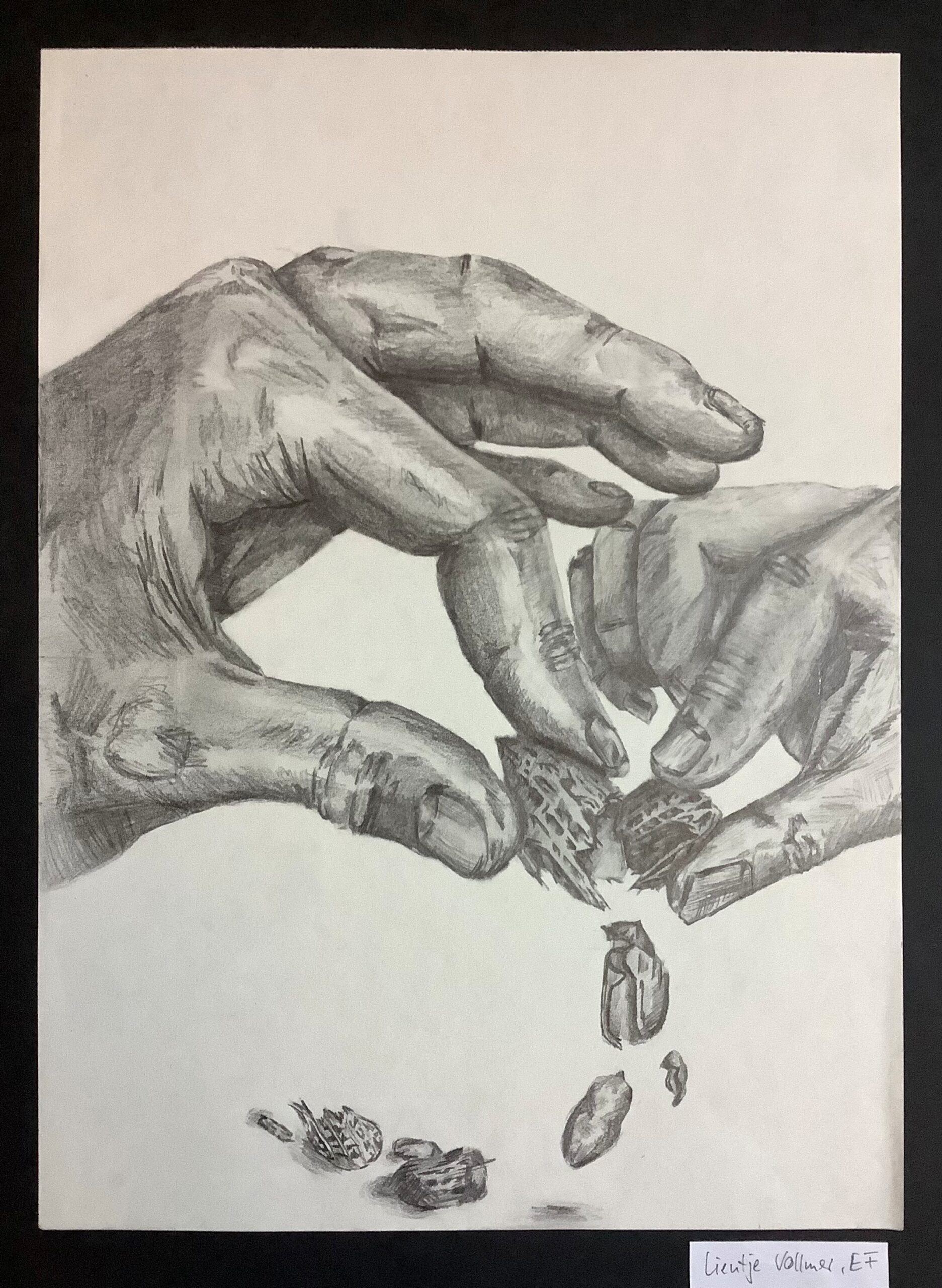 Die Kunstwerke in der Galerie zeigen eine kleine Auswahl von Zeichnungen zu den Themen Diskriminierung (Kohlezeichnung/ Q2) und Fingerfood (Bleistiftzeichnung/ EF).