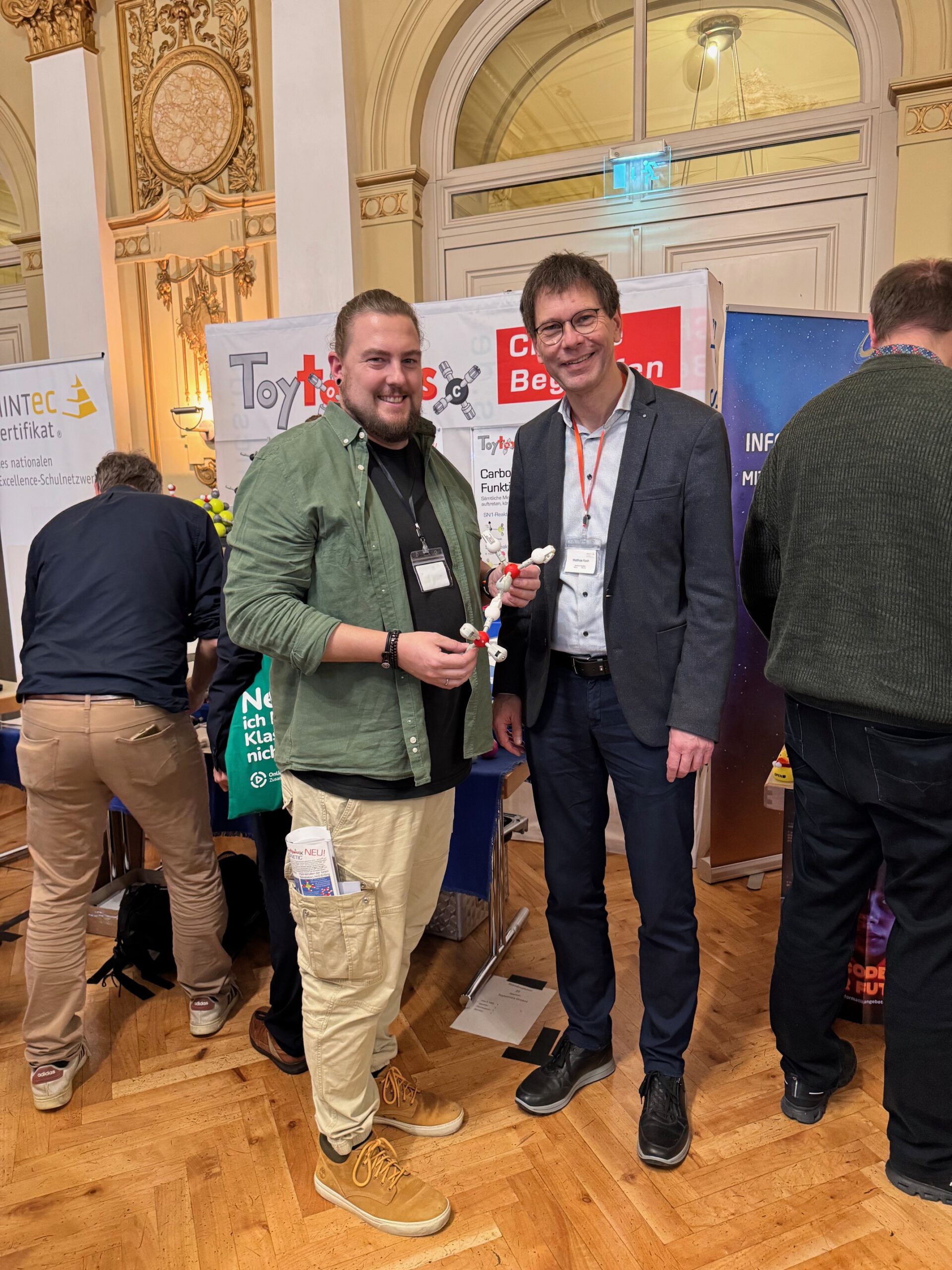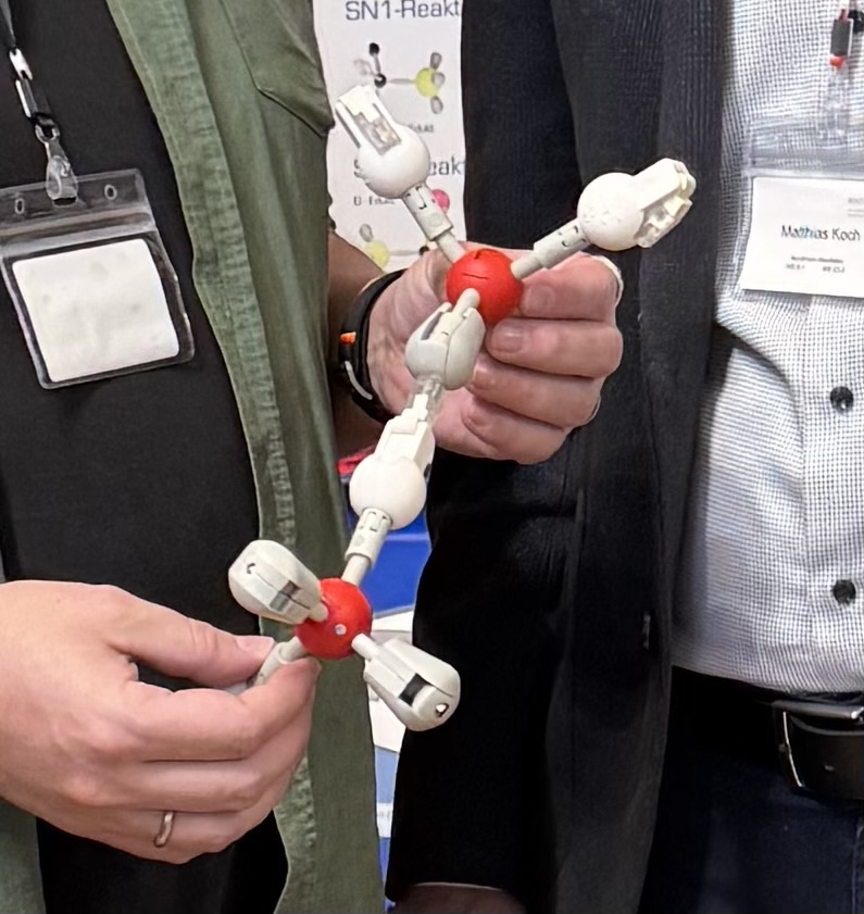 Eine neue Art Molekülbaukasten hat dabei besonders die Aufmerksamkeit erregt, diese Modelle können auch zwischenmolekulare Wechselwirkungen darstellen und das sogar maßstabsgetreu! Wer erkennt, welche zwei Moleküle Herr Allroggen in den Händen hält und welche zwischenmolekulare Wechselwirkung sie zusammenhält?