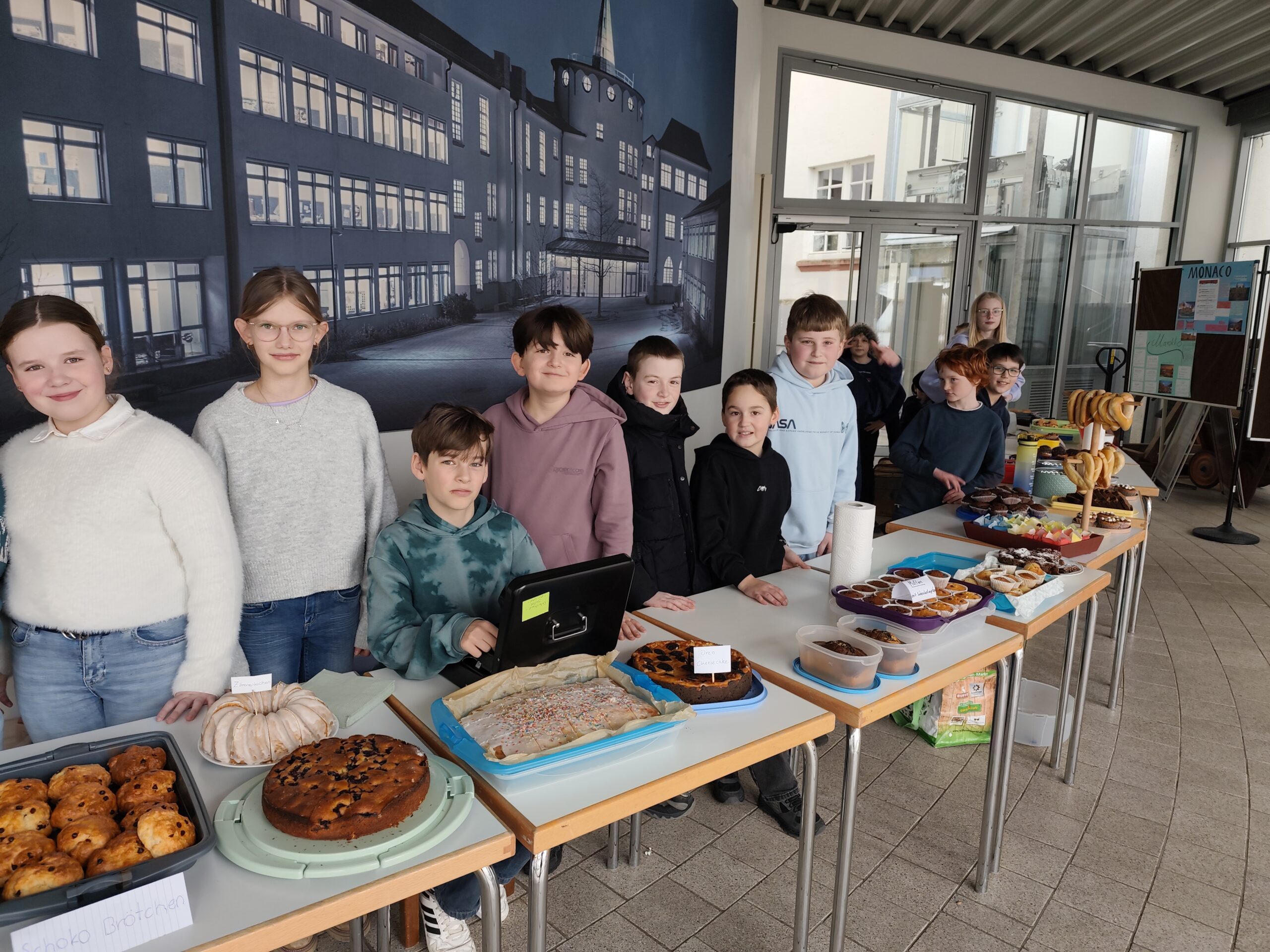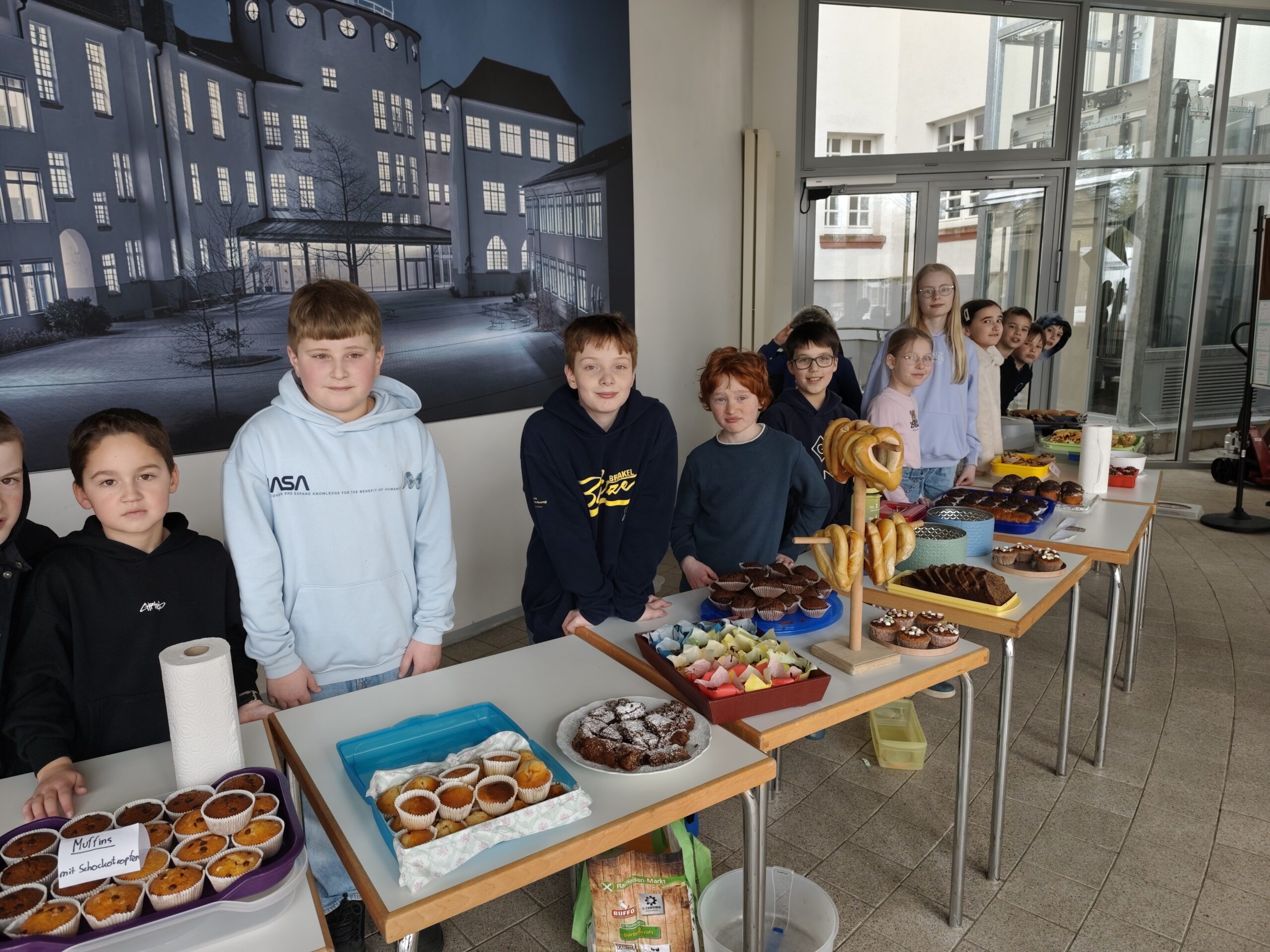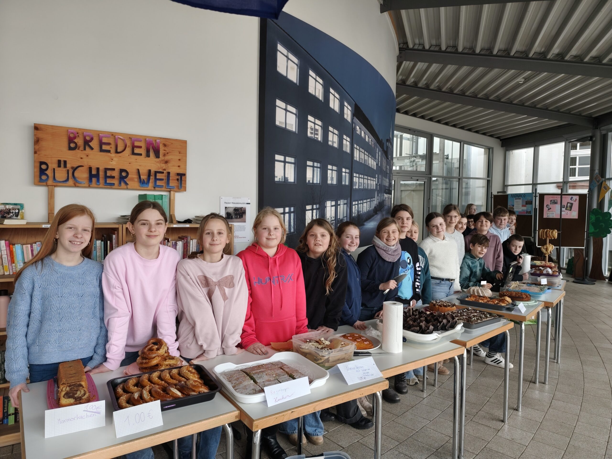 Auch wir, die Klasse 5a der Schulen der Brede, haben uns mit dieser Problematik beschäftigt und wir haben Nour und Tazim kennengelernt. Diese beiden Kinder sind 12 Jahr alt und mussten die Grundschule abbrechen, um ihre Familie zu versorgen. Tazim beispielsweise arbeitet 11 Stunden am Tag in einer Fabrik, die Alu-Töpfe herstellt, und bekommt dafür am Tag ca. 1,50€. Beide Kinder träumen davon, wieder in die Schule gehen und lernen zu können. Besonders die Schicksale von Nour und Tazim haben uns betroffen gemacht und wir haben erkannt, welche großes Privileg wir in Deutschland haben, jeden Tag in die Schule gehen zu können. Gerne wollten wir den beiden und den anderen Kindern helfen. So sind wir darauf gekommen, einen Kuchenverkauf anzubieten und pro Stück Kuchen 1,50€ zu nehmen, da das so viel Geld ist, wie Tazim an einem ganzen Tag verdient. Jede Schülerin und jeder Schüler unserer Klasse brachte einen Kuchen, Muffins oder Brezeln mit, die wir in der Mittagspause an unsere Mitschülerinnen und Mitschüler verkauften.