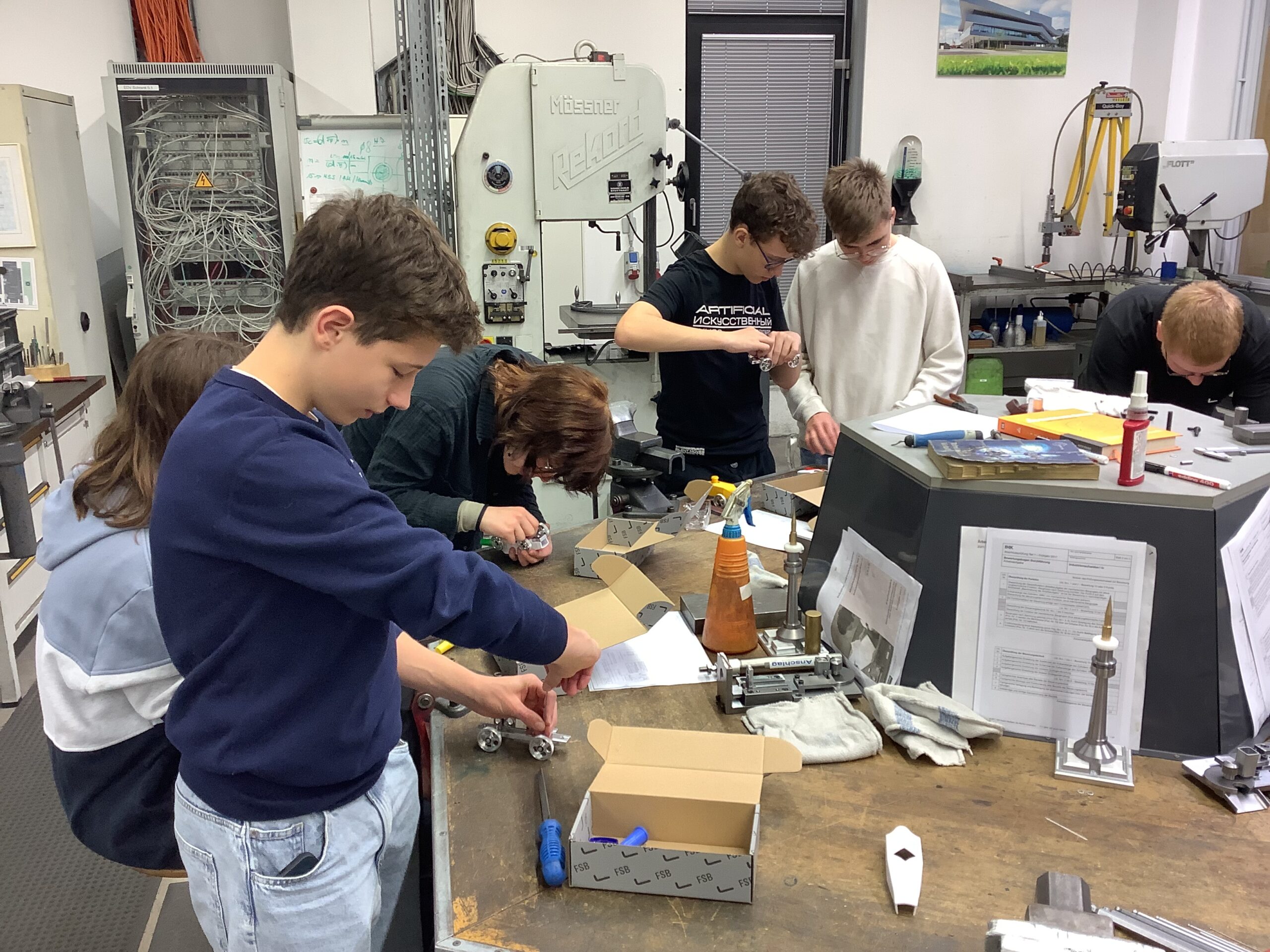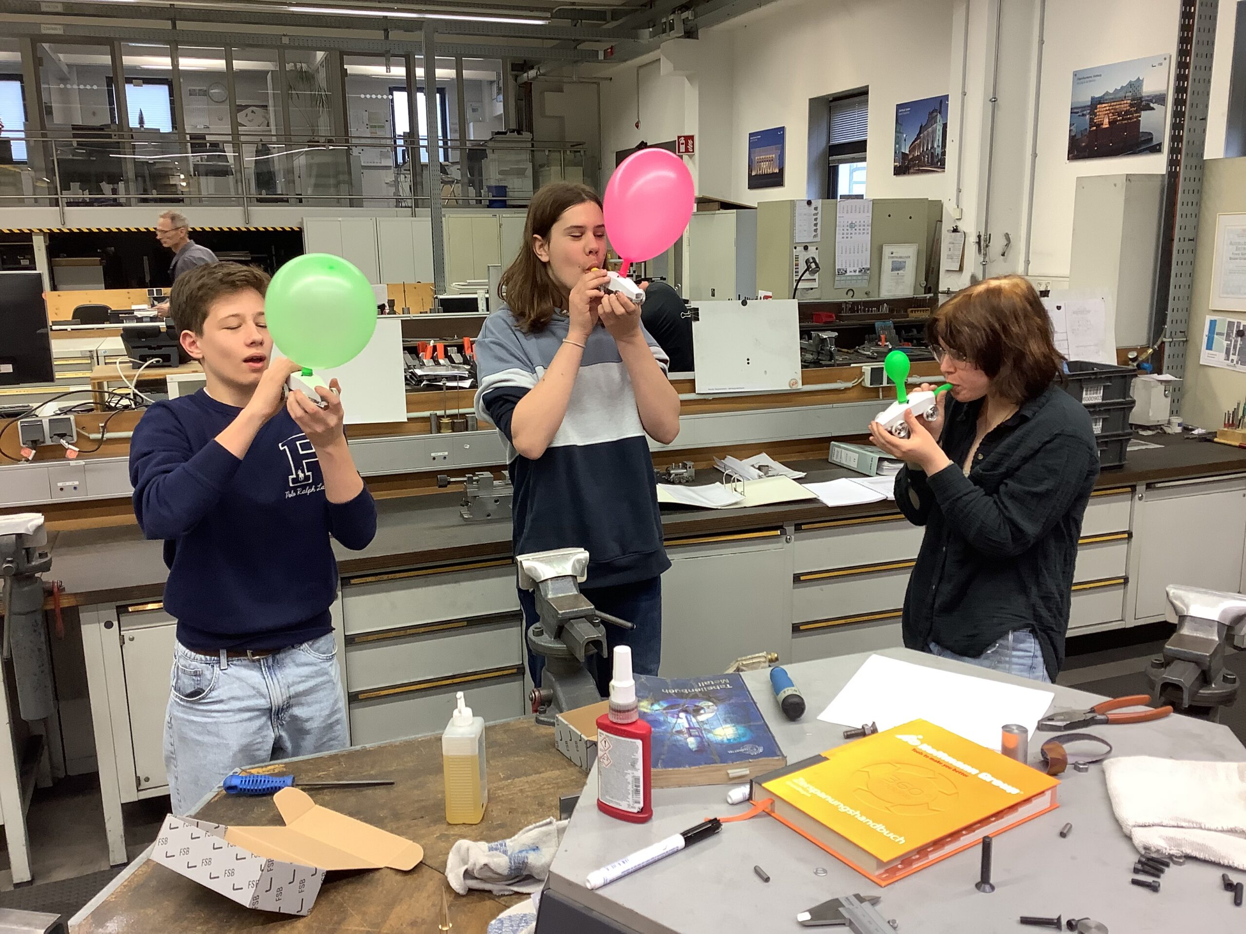 „In den letzten 12 Wochen haben 7 Schülerinnen und Schüler der 9b/9c ein kleines Auto mit Luftantrieb gebaut. Die Metallbauteile wurden bei FSB gefertigt. Fertigungsverfahren wie Drehen, Fräsen, Bohren, Gewindeschneiden etc. standen dort auf dem Programm. Für die Kunststoffteile mussten zunächst die Zeichnungen angefertigt werden, um sie danach auf dem schuleigenen 3D-Drucker auszudrucken.