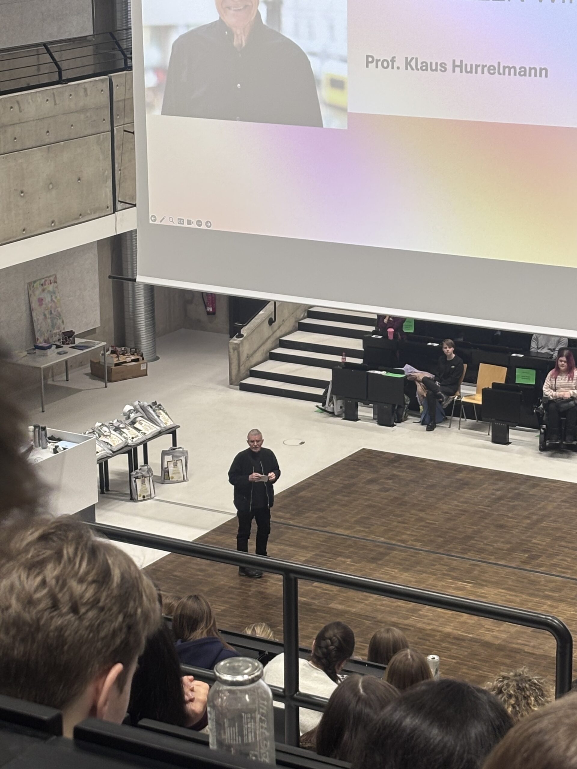 Besondere Highlights waren die Vorträge von Bildungs-Innovatorin Margret Rasfeld, Autorin Jamila Tressel und dem renommierten Bildungsforscher Prof. Klaus Hurrelmann. Für unseren LK war das Treffen mit Professor Hurrelmann ein ganz besonderer Moment: Da sein Modell zur produktiven Realitätsverarbeitung aktuell bei uns im Unterricht behandelt wird, wurde die Theorie hier auf einmal greifbare Praxis. Ein gemeinsames Erinnerungsfoto durfte dabei natürlich nicht fehlen!