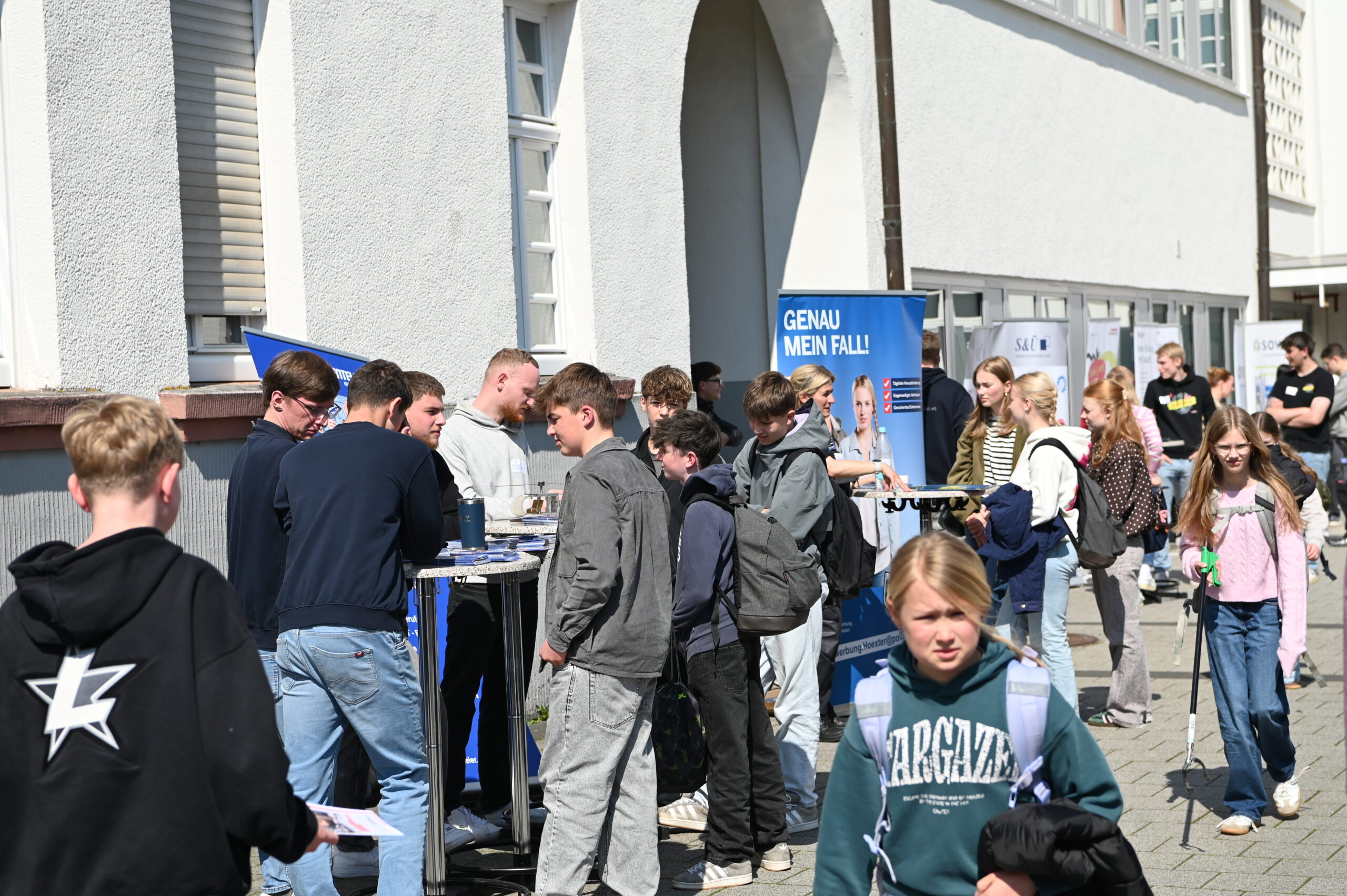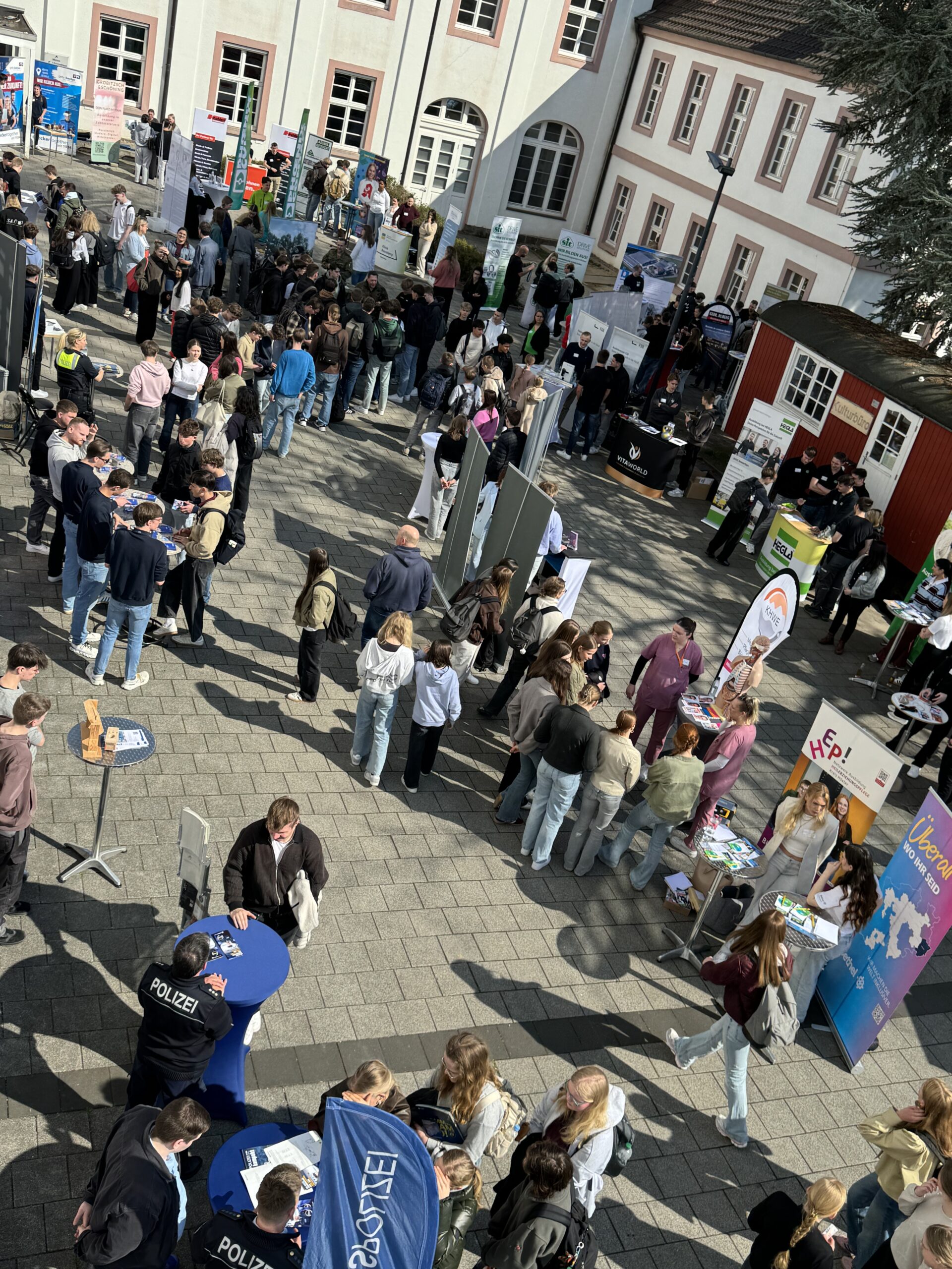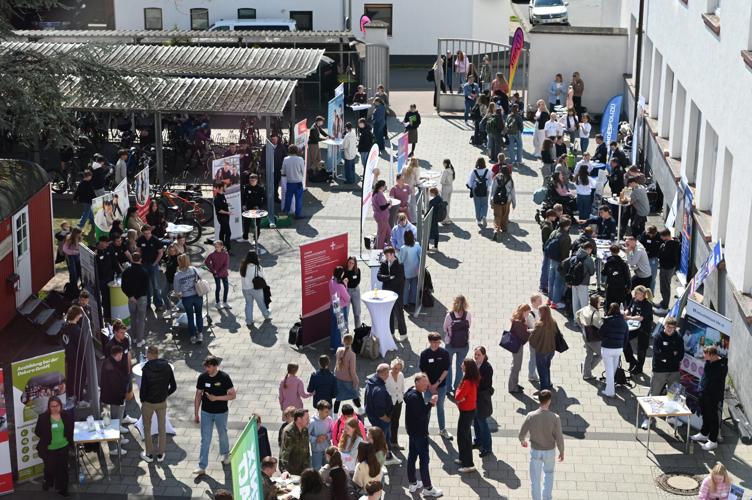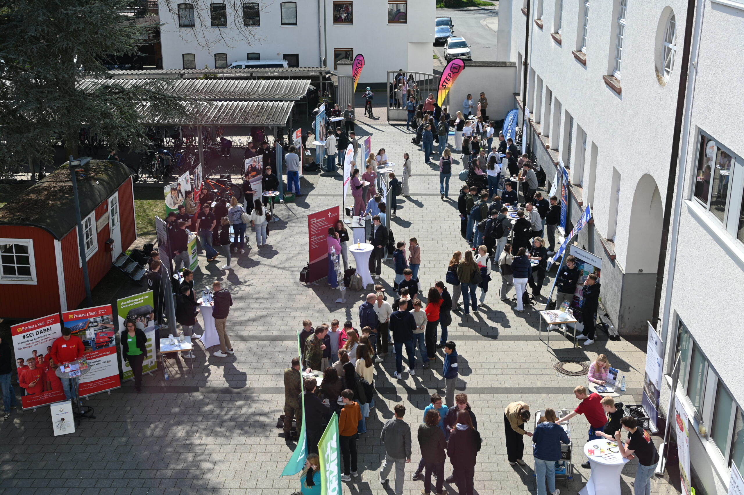 Nach einer kurzen Begrüßung durch den Schulleiter Herrn Dr. Koch präsentierten sich fast 50 Unternehmen und Einrichtungen aus der Region den Schülerinnen und Schülern nicht etwa in sterilen Messehallen, sondern ganz direkt auf dem Schulhof – mitten im gewohnten Umfeld der Jugendlichen. Diese ungezwungene Atmosphäre sorgte für ehrliche Gespräche, neugierige Fragen und zahlreiche Aha-Momente.