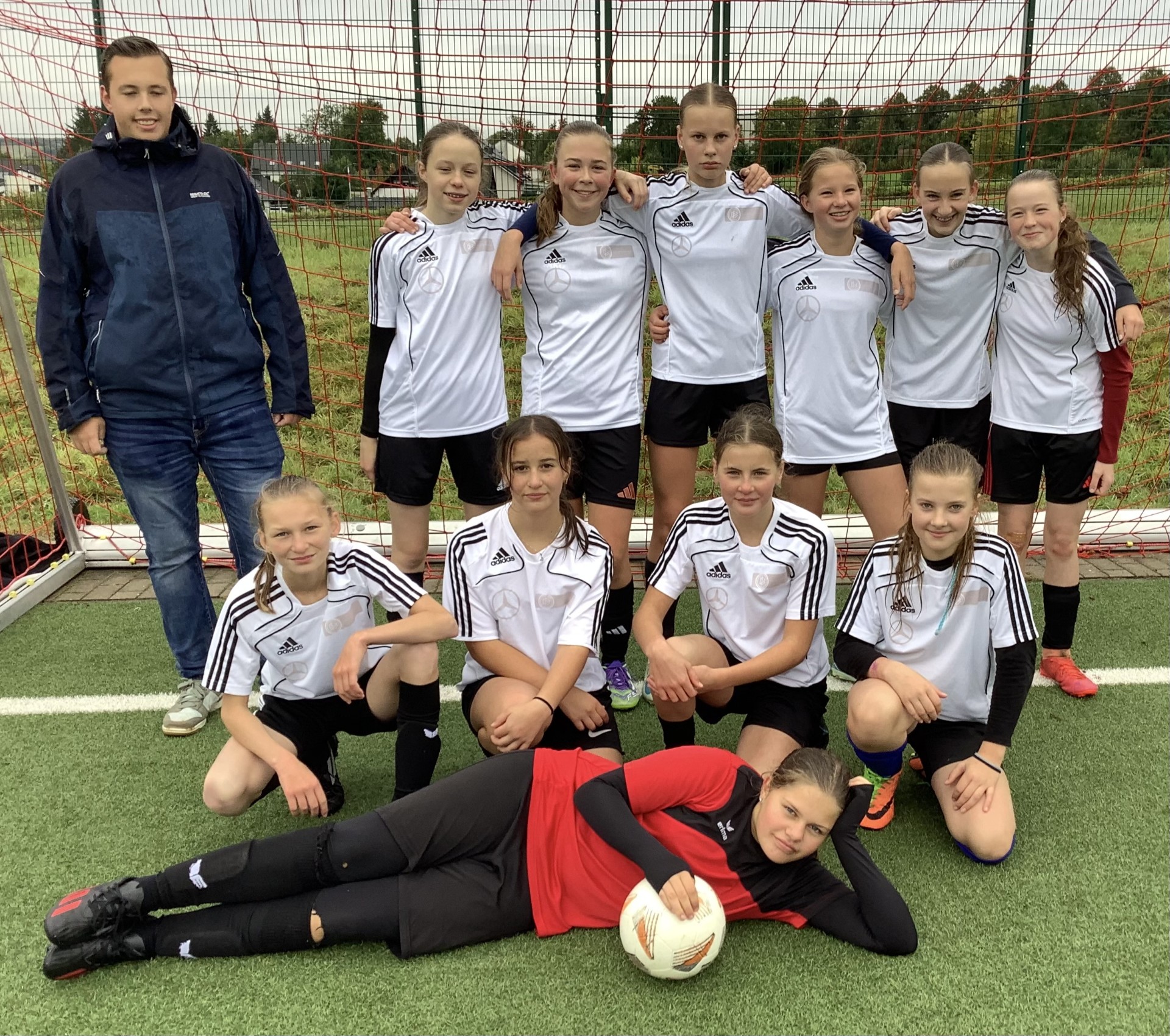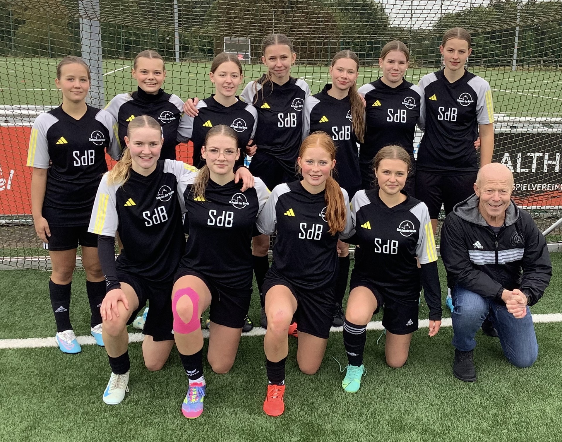Stehend von links: Leon Gockeln (Sporthelfer), Charlotte Peters, Hannah Urahne, Luna Ridder, Nora Ridder, Helen Rasche, Anna Ewers